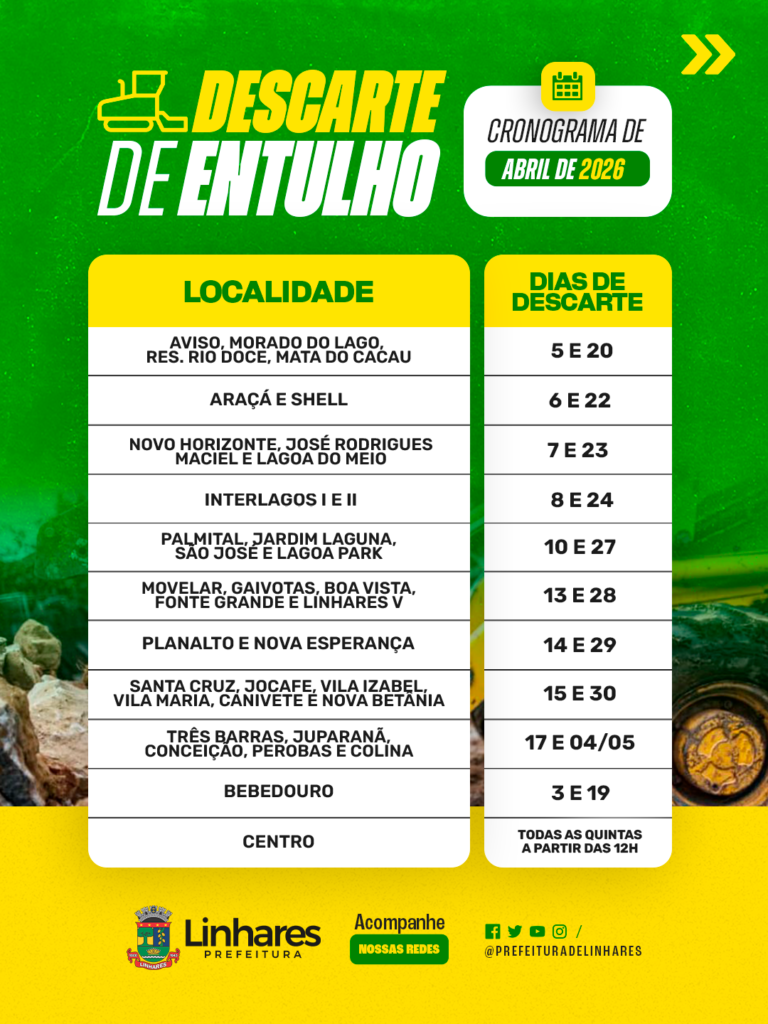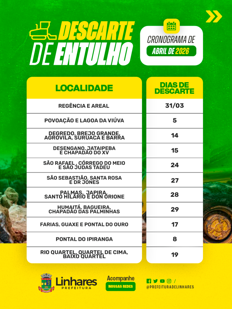 A Prefeitura de Linhares, por meio da secretaria municipal de Obras e Serviços Urbanos, divulgou nesta segunda-feira (30/3), o cronograma de descarte de entulho do mês de abril de 2026.