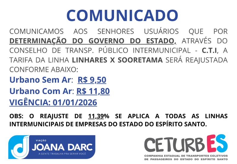 Mais uma vez o valor da passagem de ônibus coletivo vai receber reajuste e vai mexer com o bolso de quem usa a linha de ônibus Linhares-Sooretama. O valor da passagem será reajustado em 11,39%. Com isso, a passagem no coletivo urbano sem ar, conforme o comunicado, vai para R$ 9,50 e com ar para R$ 11,80. Os novos valores valem a partir desta quinta-feira, 1º de janeiro de 2026. Confira a íntegra o comunicado: